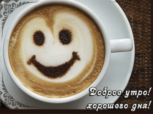 A cup of cappuccino with a smiley face in the foam, wishing a good morning and a good day.