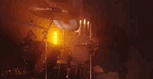 Drummer of Russian rock band Psychya performing live with atmospheric lighting and candles.