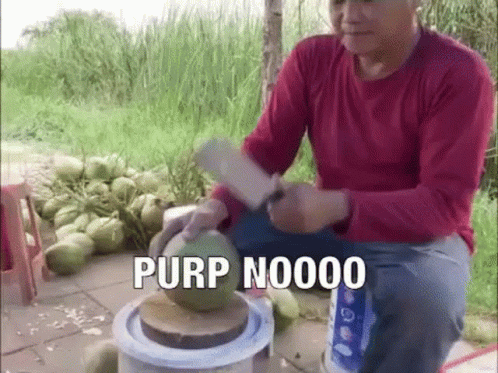 Slatts Gc chops a coconut with a large knife, accompanied by the text 'PURP NOOOO', in this clip featuring Purp Maria.