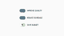 An animated demonstration of the Quality, Time, Cost (QTC) trade-off in project management, showing toggles for improving quality, reducing schedule, and saving budget.