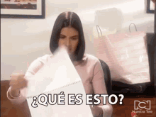Marcela Valencia (Natalia Ramirez) looks confused, holding a paper that reads '¿Qué es esto?'