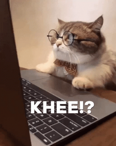 A smart cat wearing round glasses and a bow tie reacts with a surprised expression to the text 'KHEE!?' on a laptop screen.