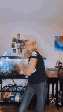 Queencheryl Kingquran dances energetically in a room, wearing a 'QUEEN' shirt, with an aquarium in the background.