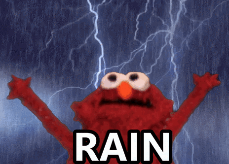 Elmo stands with arms raised as lightning flashes and rain pours down, creating a dramatic scene.