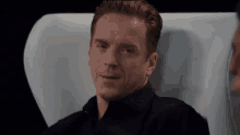 Damian Lewis as Bobby Axelrod subtly raises his eyebrows with a knowing smile, seated in a modern white chair.