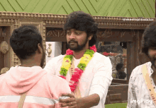 Raju Bhai, wearing a flower garland, greets another contestant on Bigg Boss Tamil.