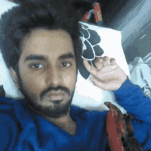 Ramsha, a man with a beard, relaxes on a bed, wearing a blue shirt.