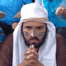A Saudi Arabian football fan, with flag face paint, reacts intensely at the World Cup.