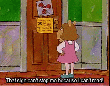 A character faces a warning sign, stating it can't stop them because they can't read.