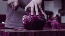 A person expertly slices a vibrant red cabbage, revealing its intricate internal patterns.