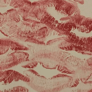 A romantic aesthetic flat lay featuring red lipstick, a pearl necklace, and a book with a kiss mark.