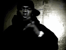 A man in a dark hoodie and baseball cap makes expressive hand gestures in a dimly lit, stark environment.
