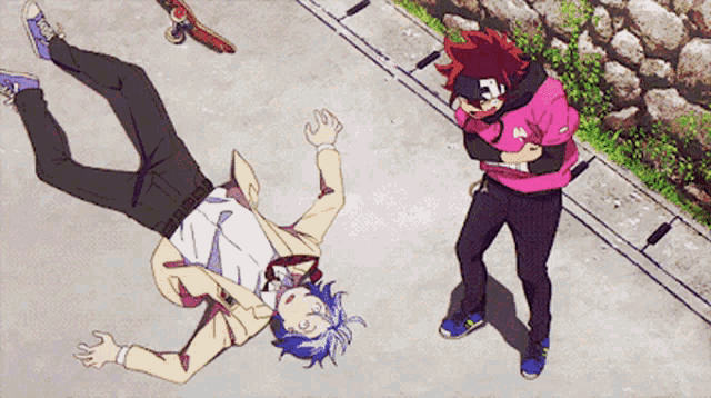 Reki from Sk8 the Infinity laughs heartily as Langa falls to the ground after a skateboarding mishap.