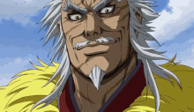 Ren Pa Lian Po, a powerful general from Kingdom, with gray hair and a beard, looks intently at the camera.