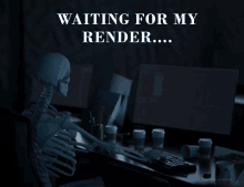 A skeleton sits patiently at a computer desk, embodying the long wait for a render to complete.