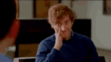 Richard, from Silicon Valley, smiles playfully, touching his face while wearing a blue sweater.