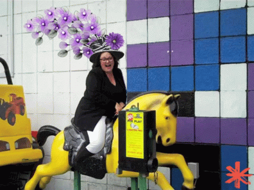 A woman in a black hat with purple flowers joyfully rides a yellow coin-operated horse amusement ride in an indoor setting.