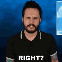 Liam Scott Edwards, a man with a beard, looks directly at the camera and asks 'Right?' while wearing a black shirt.