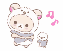Rilakumma, dressed as Kiiroitori, and Kiiroitori dancing cutely with musical notes floating around them.