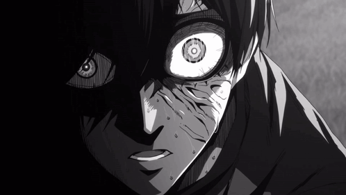 Rin Itoshi from Blue Lock with an intense, despairing expression and wide, detailed eyes in a black and white scene.