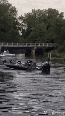 A boat with a Mercury motor cruises along a river, passing under a bridge with green trees.
