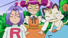 James, Jessie (Musalina), and Meowth from Team Rocket are shown with their eyes closed, appearing sad or crying.