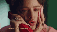 Rosalia talking intensely on a red landline phone, showcasing her long pink nails and striking makeup.