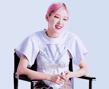 Rosé, with vibrant pink hair, smiles and laughs while wearing a white t-shirt with a 'W' design, sitting in a chair.