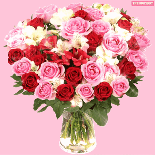 A vibrant bouquet featuring a mix of pink and red roses in a clear glass vase.