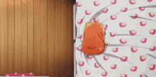 Umaru-chan, in her signature orange hooded outfit, playfully rolls off a bed and tumbles across the floor.