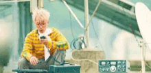 Roy Kim, with blonde hair and glasses, sits looking at his phone in a yellow striped sweater.