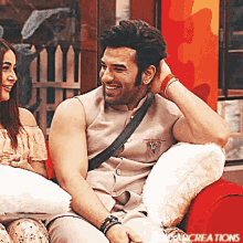 Paras Chhabra shares a joyful moment, laughing heartily while sitting on a red couch with a woman during Bigg Boss 13.