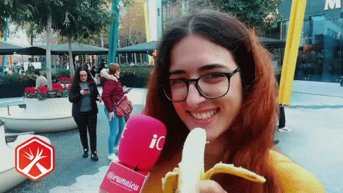 Aida Fita eating a banana while holding a microphone from Rumescu Romescu in a public setting.