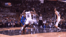 Russel Westbrook of Oklahoma City executes a powerful dunk over Kawhi Leonard during an NBA game.