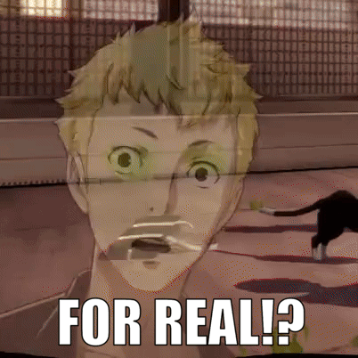 Ryuji Sakamoto from Persona 5 Royal reacts with a surprised 'For Real!?' expression.