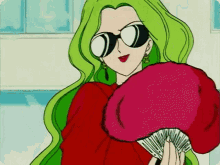Esmeraude, the green-haired villain from Sailor Moon, poses confidently with sunglasses and a pink fan.