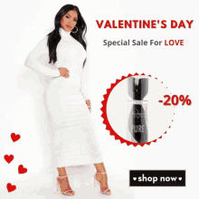 Woman in a white dress promoting a Valentine's Day special sale with 20% off on hair products. Shop now for love.