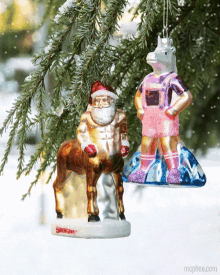 Unique Christmas ornaments: a Santaur (Santa as a centaur) and a unicorn in overalls, hanging on a snowy tree.