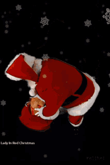 An animated Santa Claus stands up, holding a beautifully wrapped Christmas gift amidst falling snowflakes.