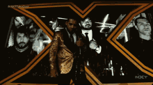 Santos Escobar makes a grand entrance in a striking gold suit at NXT TakeOver XXX, holding his championship.