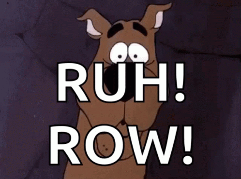 Scooby Doo looks scared and says his iconic 'Ruh-Roh!' catchphrase, a classic cartoon moment.