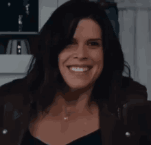 Neve Campbell as Sidney Prescott transitions from a happy smile to a serious, shocked expression.