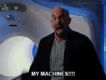 A bald man from the show Scrubs angrily yells 'MY MACHINES!!!!' in front of a large medical scanner.