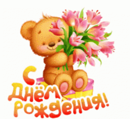 A cute teddy bear holds a bouquet of pink tulips, with 'Happy Birthday!' text displayed.