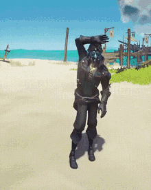 A character from Sea of Thieves, wearing a gas mask, waves on a sandy beach.