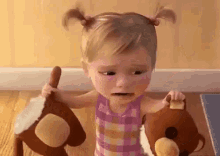 A little girl from Inside Out cries out 'MAMAAA' while holding a brown stuffed animal and a teapot.