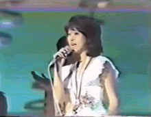 Japanese idol Seiko Matsuda performs live on stage, singing into a microphone in a white ruffled dress.