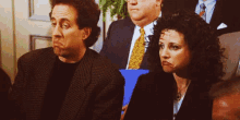Jerry Seinfeld and Elaine Benes make a synchronized disappointed pout, looking at each other in a classic Seinfeld moment.