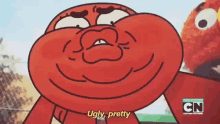 Darwin from Gumball makes a selfie face, saying 'Ugly, pretty' in front of a Cartoon Network logo.