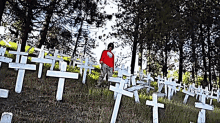 Sematary of Haunted Mound stands amidst a field of white crosses in a somber cemetery setting.